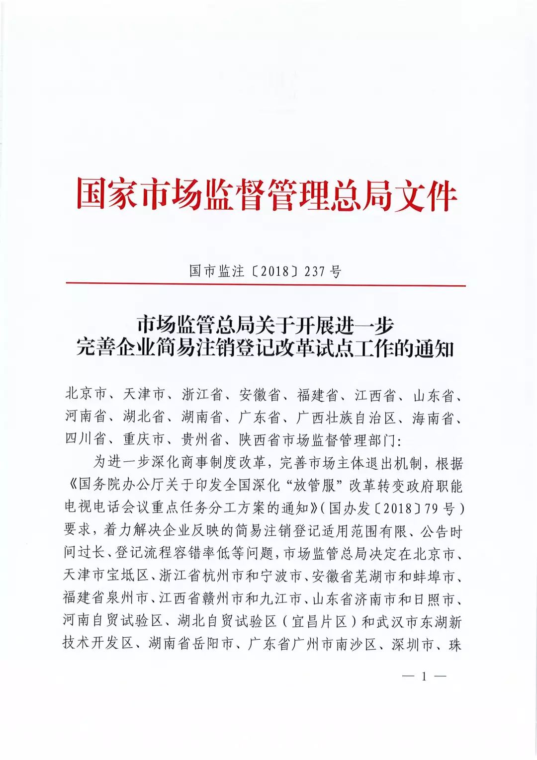 市場監(jiān)管總局關于開展進一步完善企業(yè)簡易注銷登記改革試點工作的通知(國市監(jiān)注〔2018〕237號)